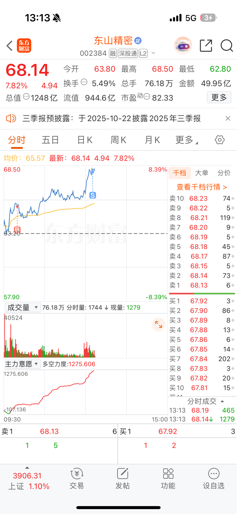 $东山精密(SZ002384)$ 补个缺口走了。不敢买了