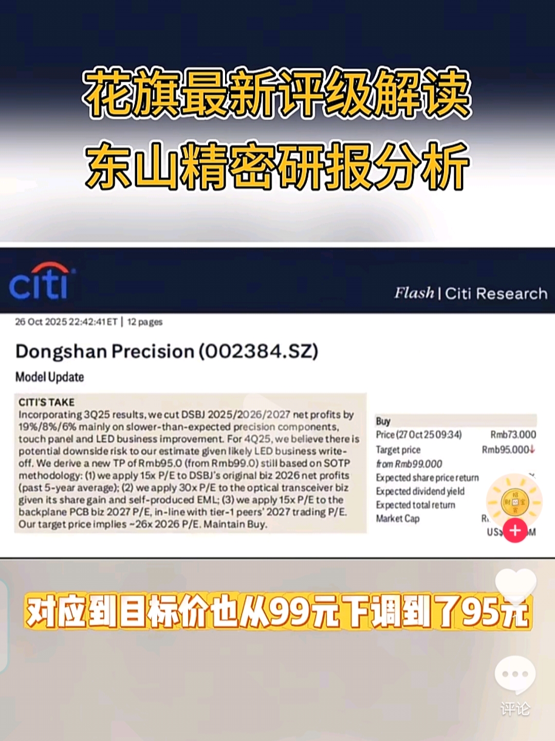 $东山精密(SZ002384)$ 花旗10月27最新评级 目标价95元