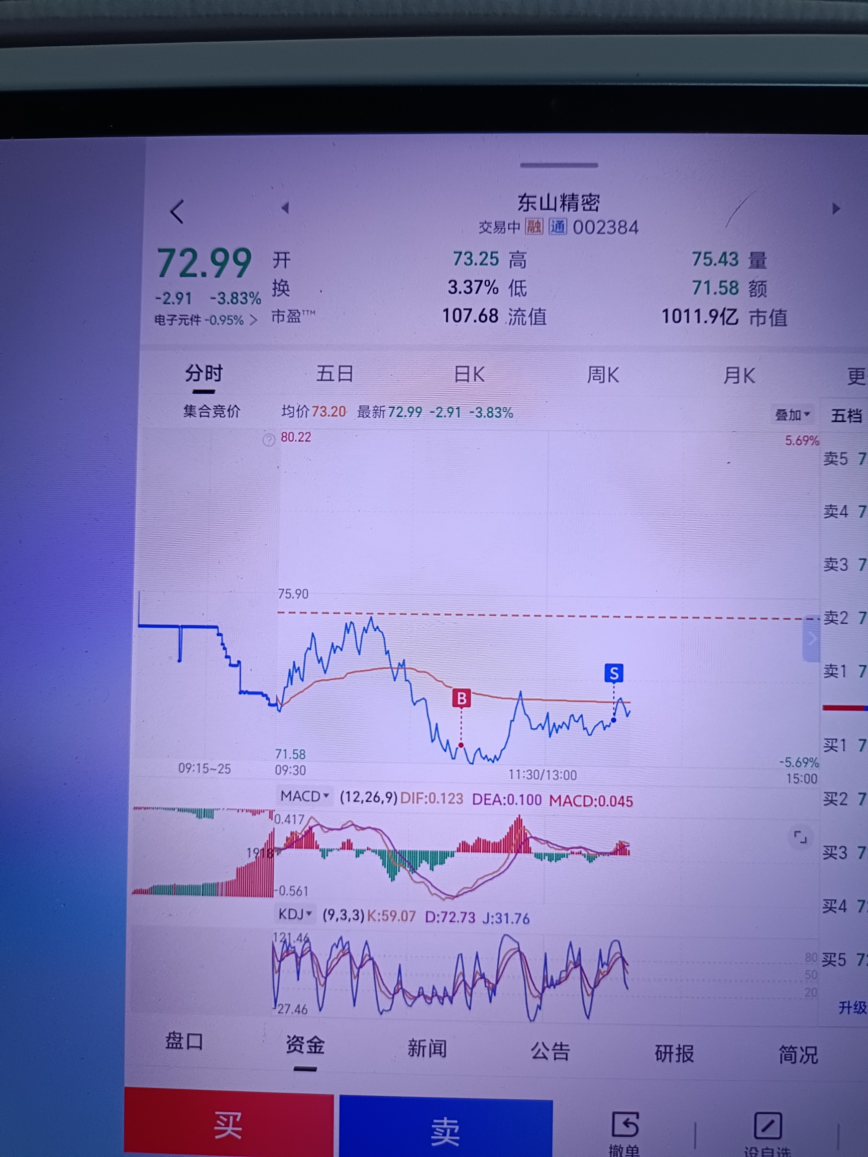 $东山精密(SZ002384)$ 昨天我说买一手把股价打下来,真灵验啊哈哈哈哈!顺手做个T,随便跌!做T水平差点,莫笑哦。