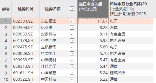 Choice数据显示,12月12日,资金净流入额排名前十的个股依次是东山精密、比亚迪、安泰科技、中国西电、立讯精密、特变电工、中洲特材、仕佳光子、中国核建、中天科技。其中,东山精密当日资金净流入额为11.07亿元。