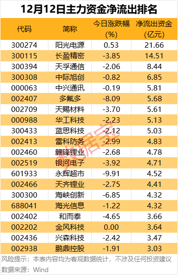 36股主力资金净流出超2亿元,其中,阳光电源、长盈精密、天孚通信、中际旭创、中兴通讯、多氟多、天赐材料等净流出金额均超5亿元。