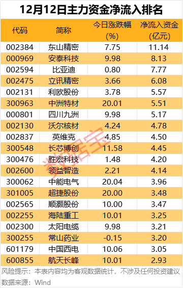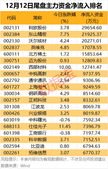 个股方面,利欧股份、东山精密、沃尔核材尾盘净流入均超2亿元,英维克、北方稀土、迈为股份、西部材料净流入均超1亿元。
