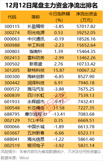 尾盘净流出方面,长盈精密、阳光电源主力资金净流出均超3亿元;中兴通讯、华工科技、指南针、雷科防务、新易盛、联特科技净流出均超1亿元。