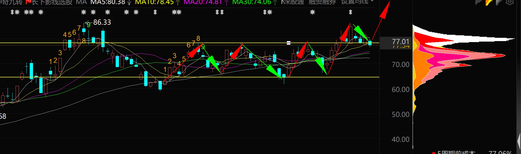 不要太慌,不是昨天追高进来的,就不要着急,刚刚突破箱体运行,这周回踩箱体确认,好一点的走势就是回踩76确认完成而后重新突破箱体上沿,走差的话,回踩73箱体内部确认,而后再上去,目前刚好在箱体上沿附近运行,多等一等,博弈错了就认输,时间换空间。