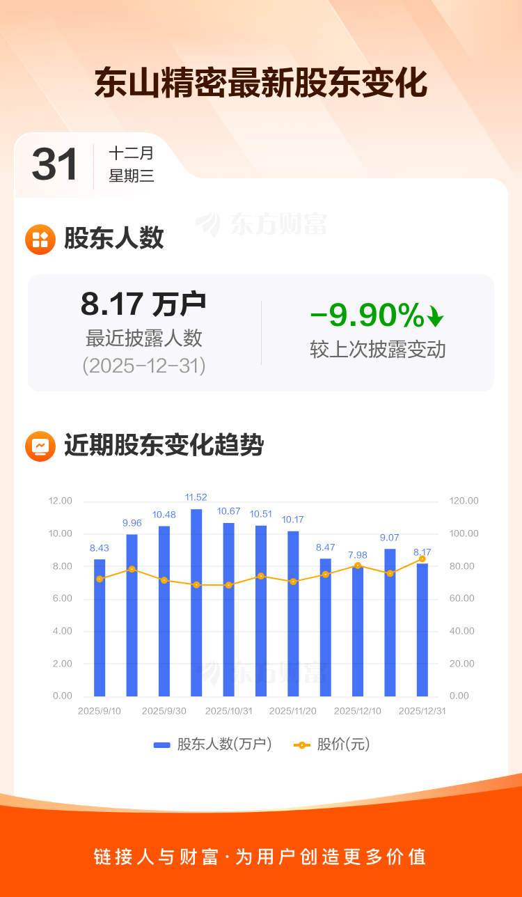 东山精密:截至12月31日最新股东户数8.17万户,较上期减少9.90%