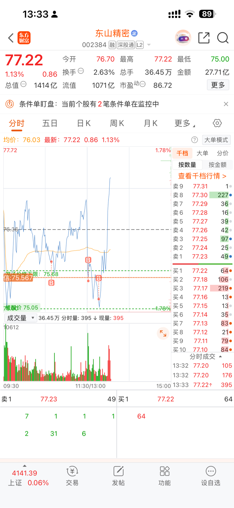 $东山精密(SZ002384)$ 哎,如果能在日线级别的超卖区间里再跌两天就好啦,现在没完成建仓任务就拉尴尬了