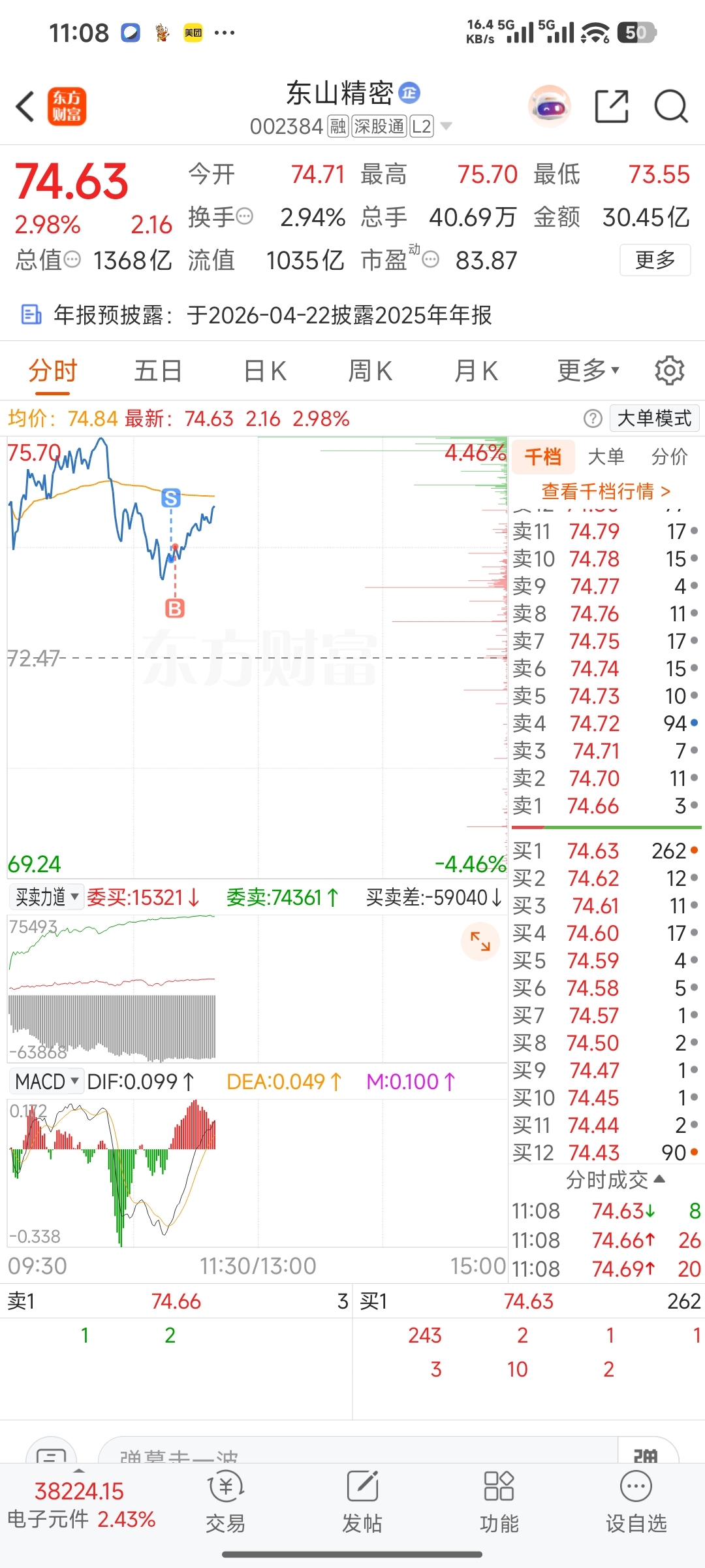 $东山精密(SZ002384)$ 又做了个反T,一直说要格局到80,但看到75抛压这么大,还是忍不住