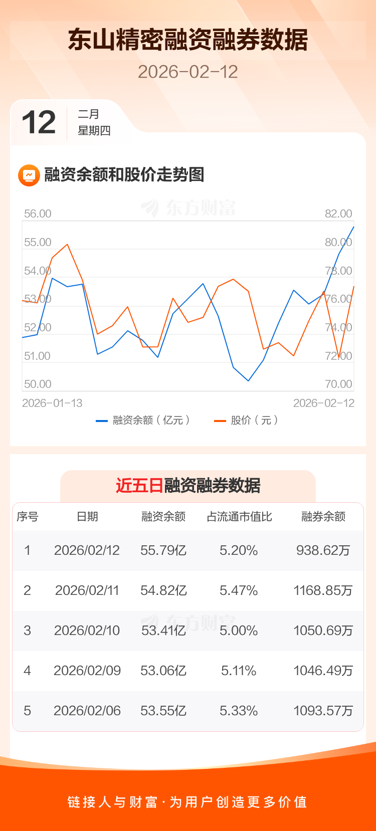 交易所最新数据显示,东山精密于2026年2月12日获融资买入8.28亿元,融资偿还7.31亿元,当日融资净买入9670.51万元。目前,该股融资余额55.79亿,占流通市值比例为5.20%。