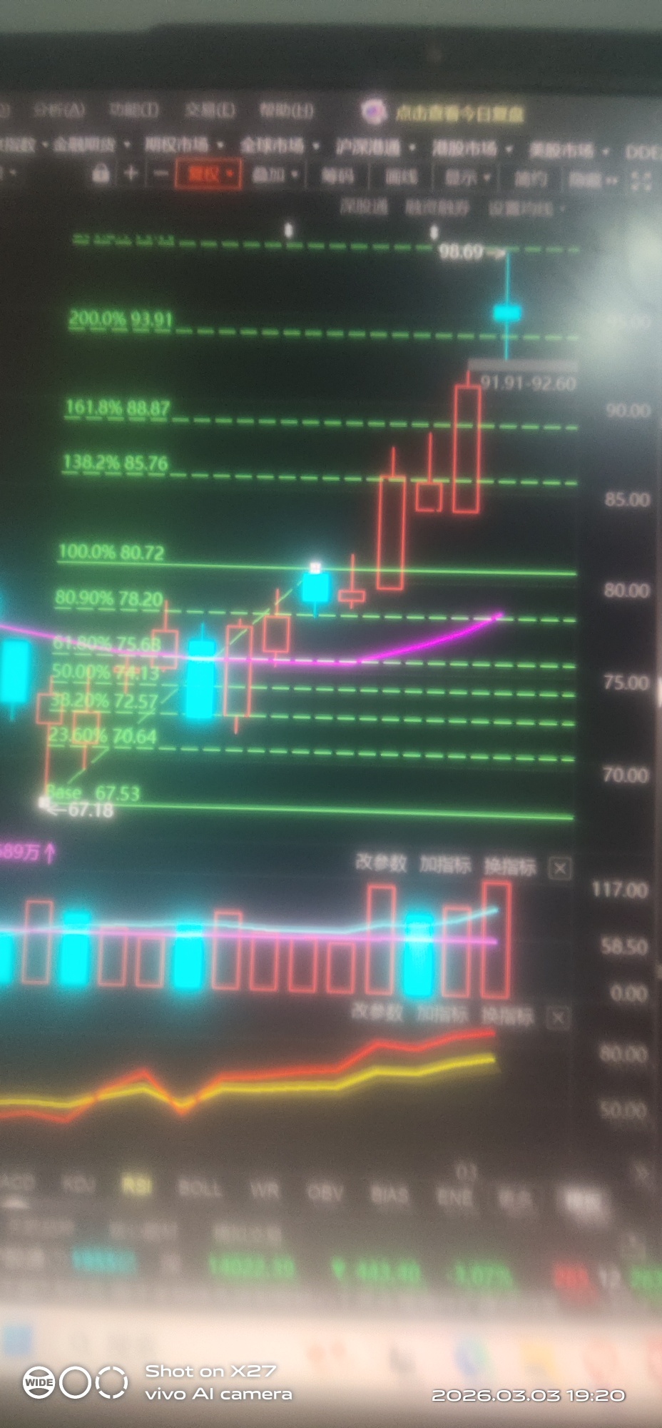 用斐波纳奇数列测阶段高点(阻力位)如图,98.69元,与今日高点分毫不差,见图