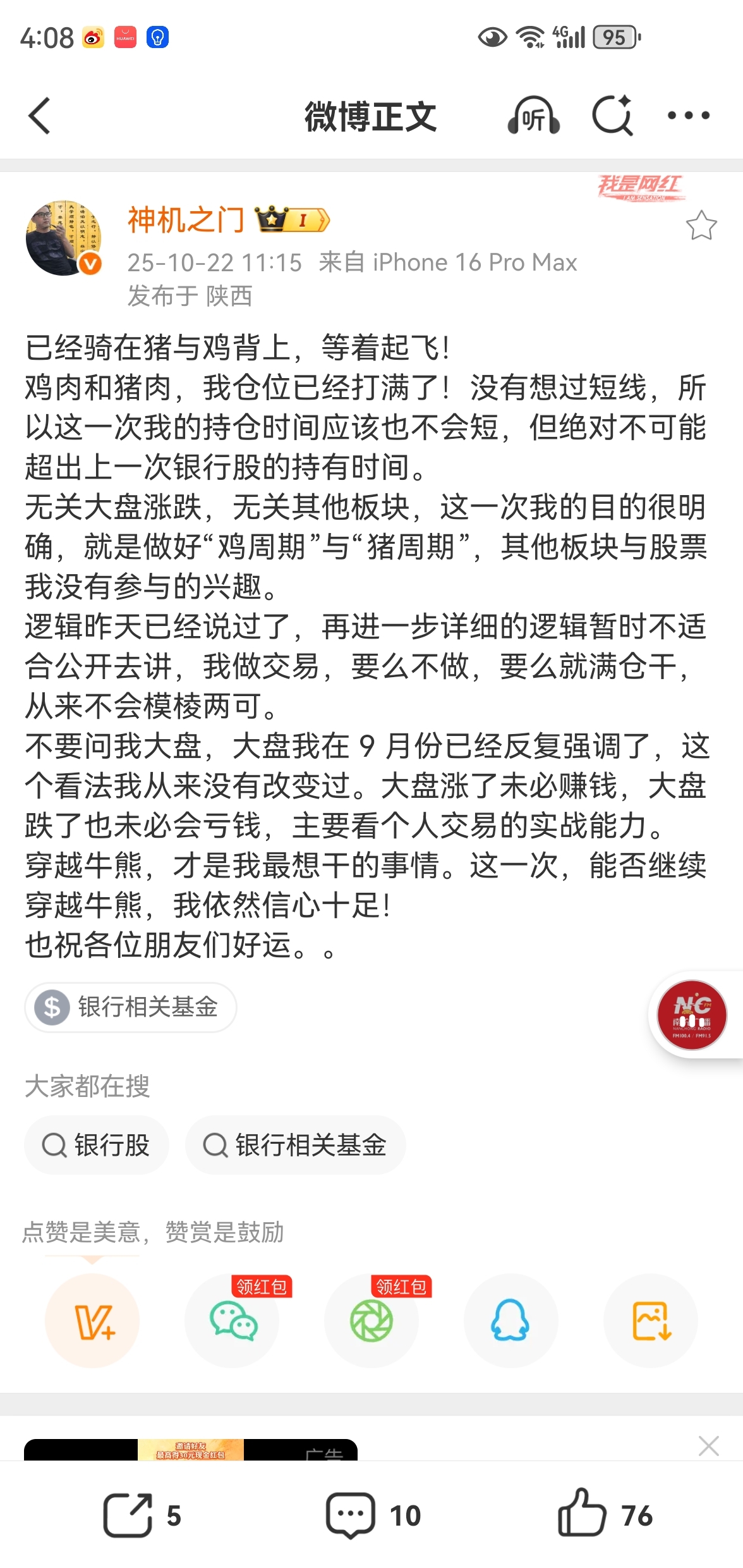 $大北农(SZ002385)$ 这个大微,全仓了猪和鸡