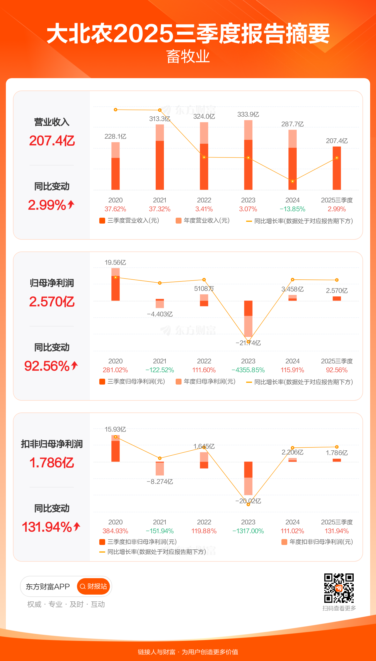 大北农10月23日发布2025年三季报显示,公司前三季实现营业收入207.44亿元,同比增长2.99%;归母净利润2.57亿元,同比增长92.56%;扣非归母净利润1.79亿元,同比增长131.94%。