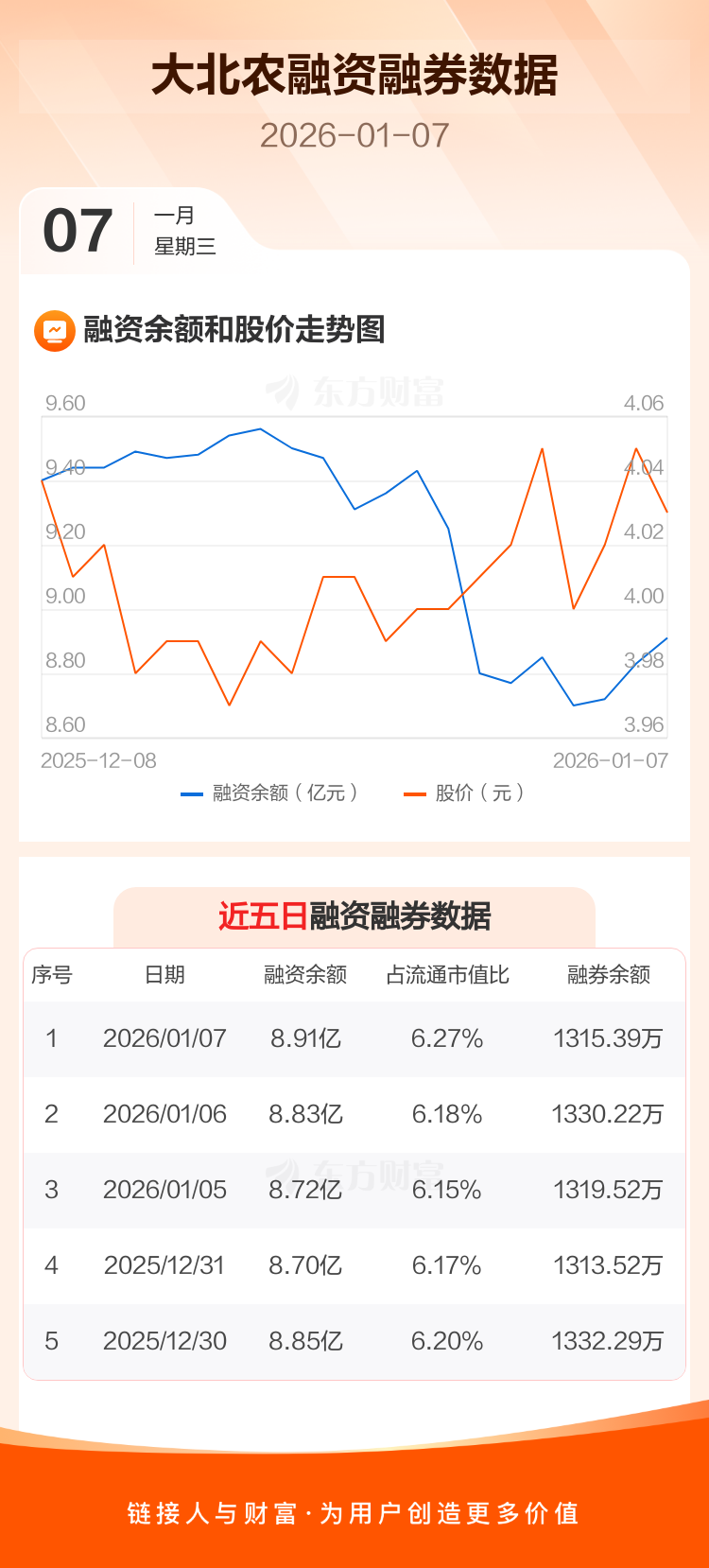 交易所最新数据显示,大北农于2026年1月7日获融资买入5680.85万元,融资偿还4868.77万元,当日融资净买入812.09万元。目前,该股融资余额8.91亿,占流通市值比例为6.27%。