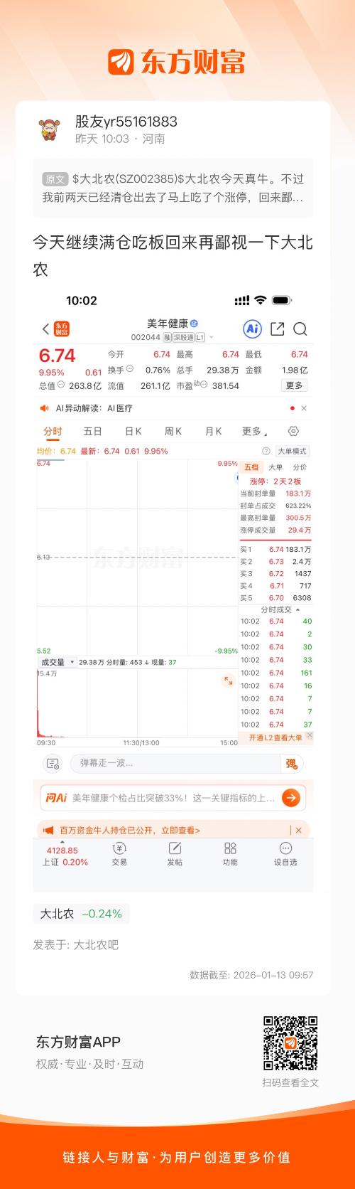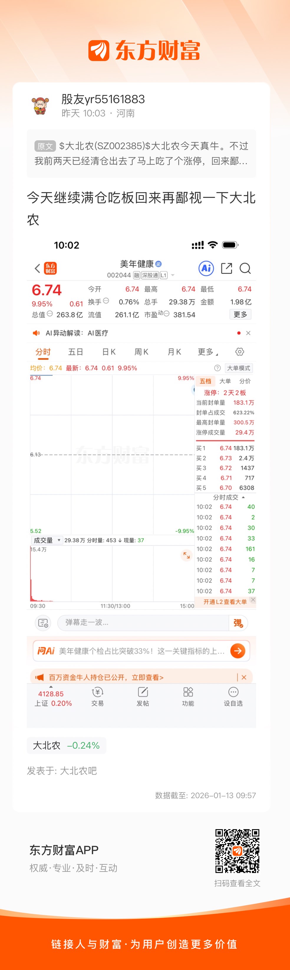 今天是离开大北农的第六天,美年吃到了第三个板。发财了,回来再鄙视一下