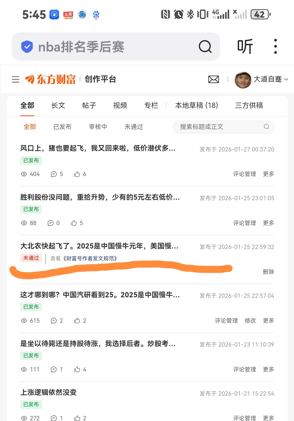 帮我分析一下,为什么没让我发出来?周日我敏锐地捕捉到大北农起势的点,结果写的几句话没被发出来 周一晚上发的一条发出来了。我说的没有敏感词汇呀?难道泄密啦?大北农一直没撤完,一直有一成仓位,上周突然想起大北农,一分析觉得有戏,加仓了。但不明白周日的贴没让我发。