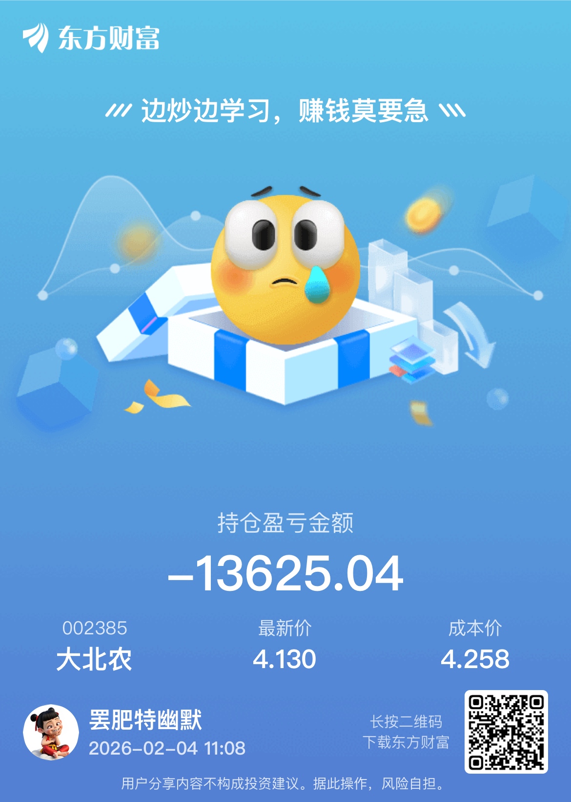 温馨提示: 1.根据《证券法》规定,禁止编造、传播虚假信息或者误导性信息,扰乱证券市场;2.用户在本社区发表的所有资料、言论等仅代表个人观点,与本网站立场无关,不对您构成任何投资建议。用户应基于自己的独立判断,自行决定证券投资并承担相应风险。《东方财富社区管理规定》
