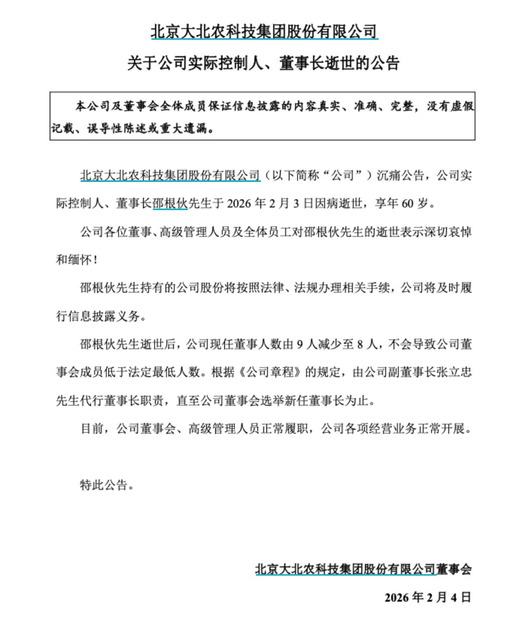 2月4日,大北农发布公告称,公司实际控制人、董事长邵根伙于2026年2月3日因病逝世,享年60岁。