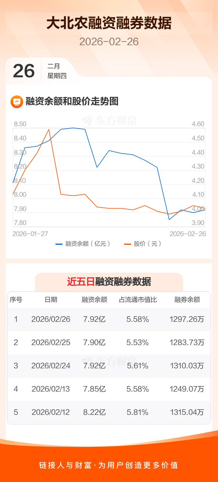交易所最新数据显示,大北农于2026年2月26日获融资买入4683.82万元,融资偿还4429.80万元,当日融资净买入254.02万元。目前,该股融资余额7.92亿,占流通市值比例为5.58%。