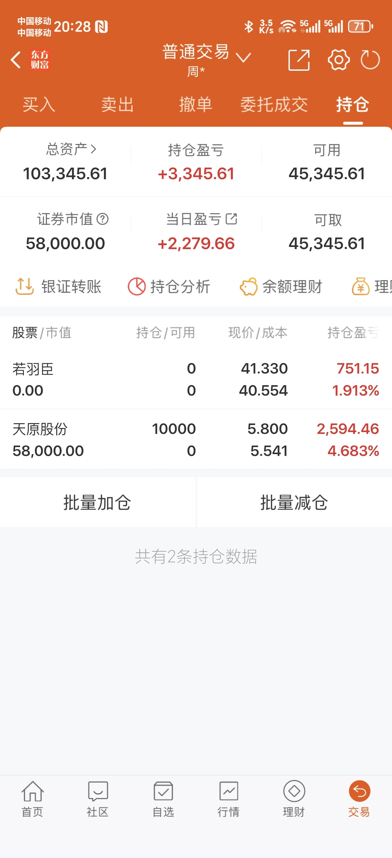 今天操作:卖出若羽臣买入:002386天原股份总资产:103345