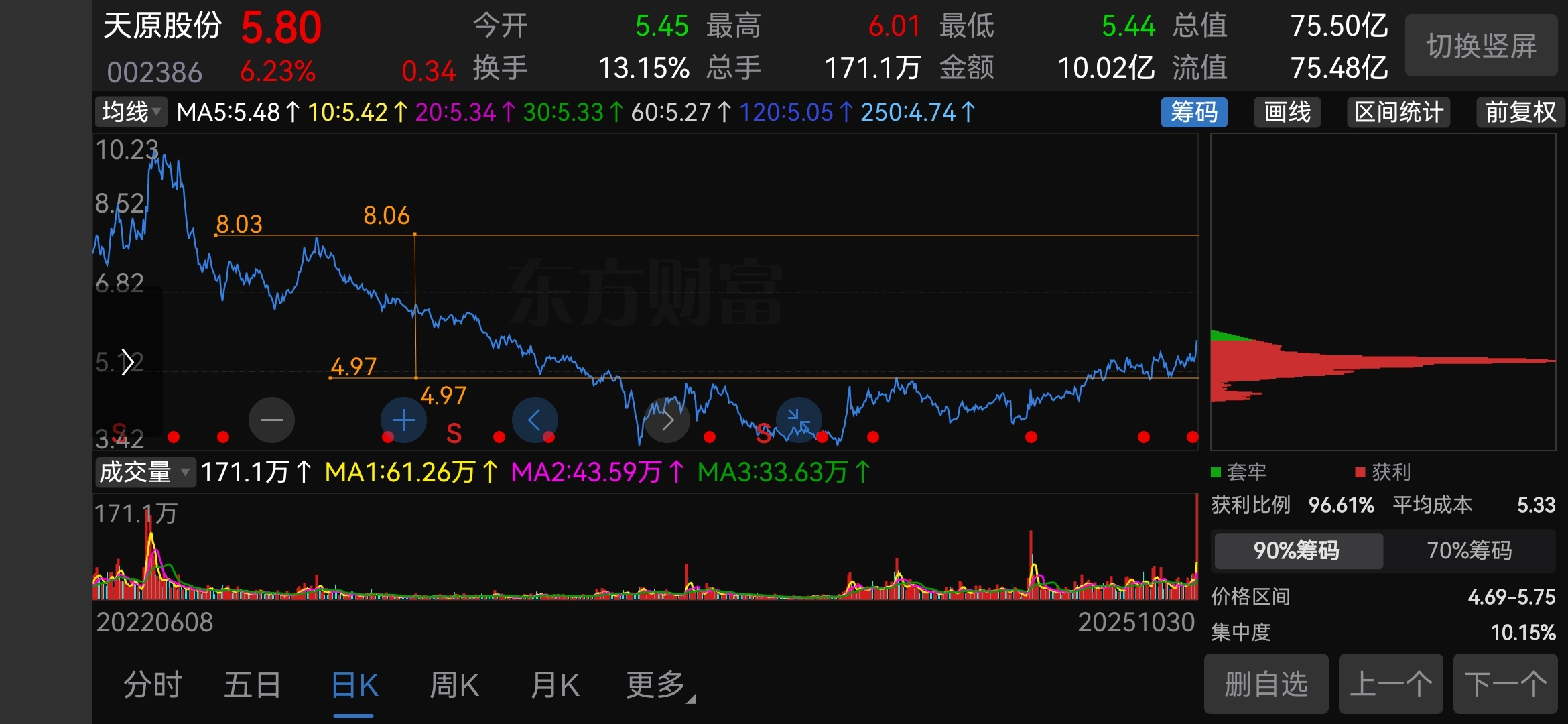 有人问我个人目标价,特别声明,我看到的空间,并个表示我一定拿的到,这个价格画线是我买进时因为看到的潜在利润空间,有空间我才买的,现在随着价格的上涨,空间也在慢慢变小,如果现在再让我买也许我自己也会多考虑一下,我的观点5元以下是底部,6元上方开始有一点点风险了,当然7元就不会考虑再买了。