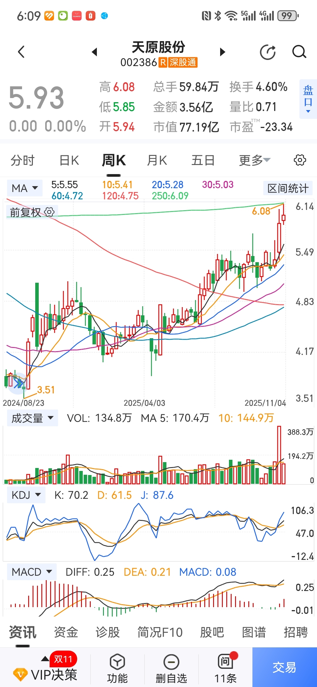 $天原股份(SZ002386)$ 顶到周线了,周线这几个月还一直抬高,过了周线,盘整一下,就迎来希望。