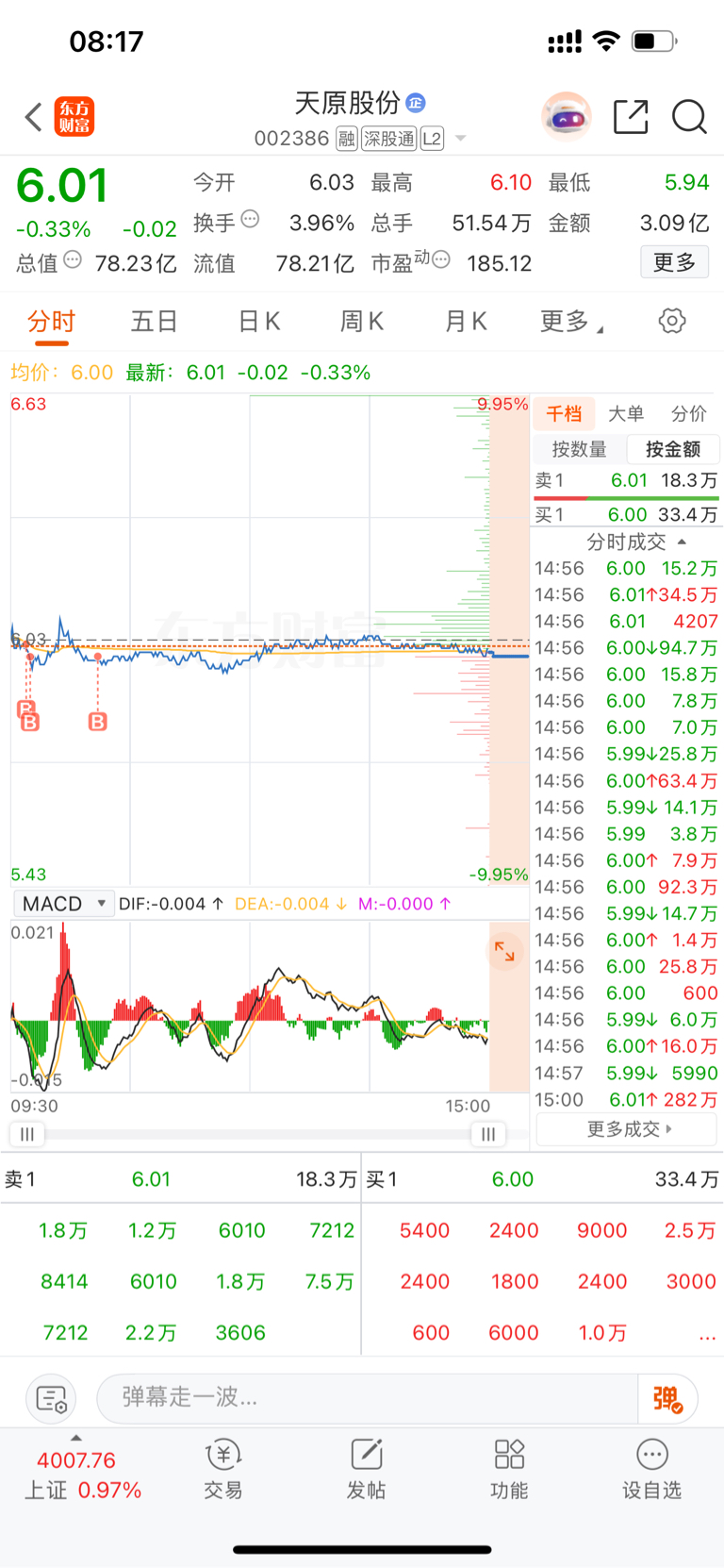 $天原股份(SZ002386)$ 昨天化工板块集体反弹,天原却背道而驰走出了,织布机趋势,换手,量能萎缩到最低点!