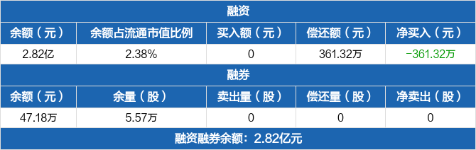 融资方面,当日融资买入0元,融资偿还361.32万元,融资净偿还361.32万元,连续5日净偿还累计825.99万元。融券方面,融券卖出0股,融券偿还0股,融券余量5.57万股,融券余额47.18万元。融资融券余额合计2.82亿元。