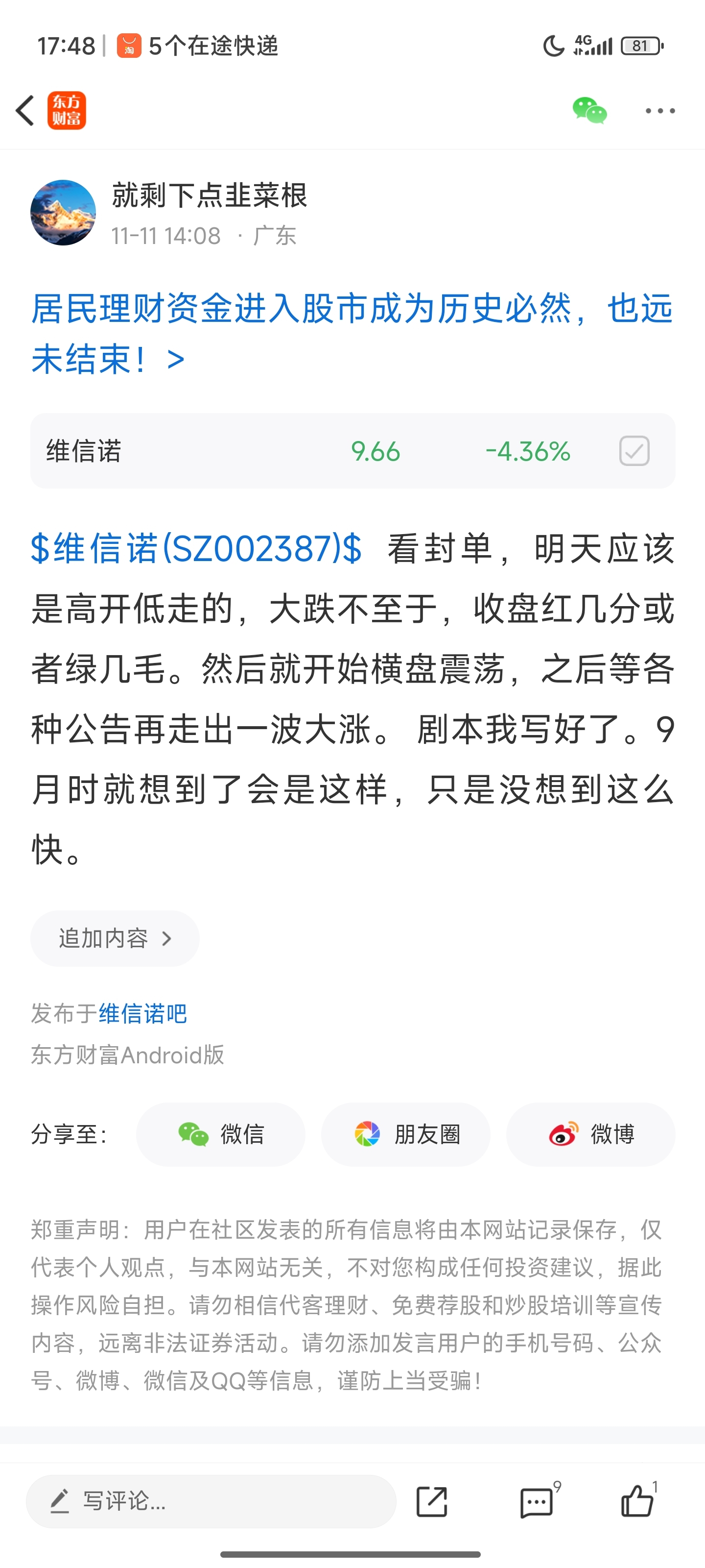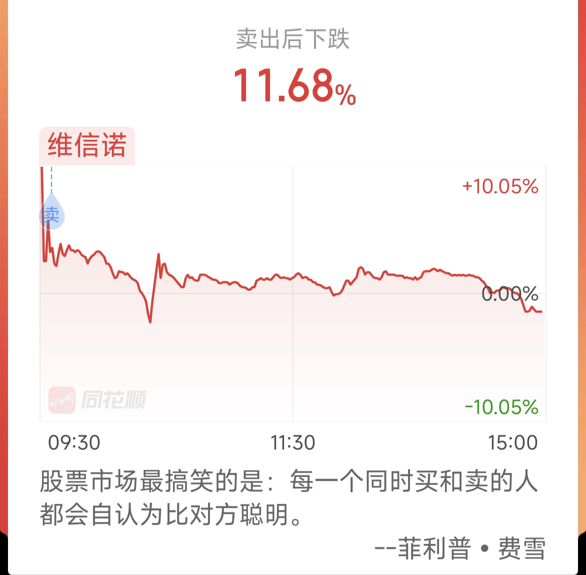 $维信诺(SZ002387)$ 昨天涨停卖了,但还是看好的,因此今天低位建仓买入。总体和预测的差不多,明天开盘有概率还得跌几个点,追高套的不割股价不涨。坐等新一轮震荡调整后的上涨。本月冲破11.28的概率 比跌破8.5的概率点,除非4000点崩盘下去。