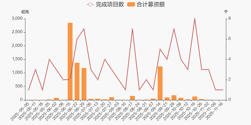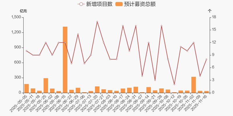 本周(2025/11/09-2025/11/16)共新增8例定增预案,预计募集资金共计36.57亿元,新增项目数量环比增加4例,预计募资总额环比降低2.43亿。
