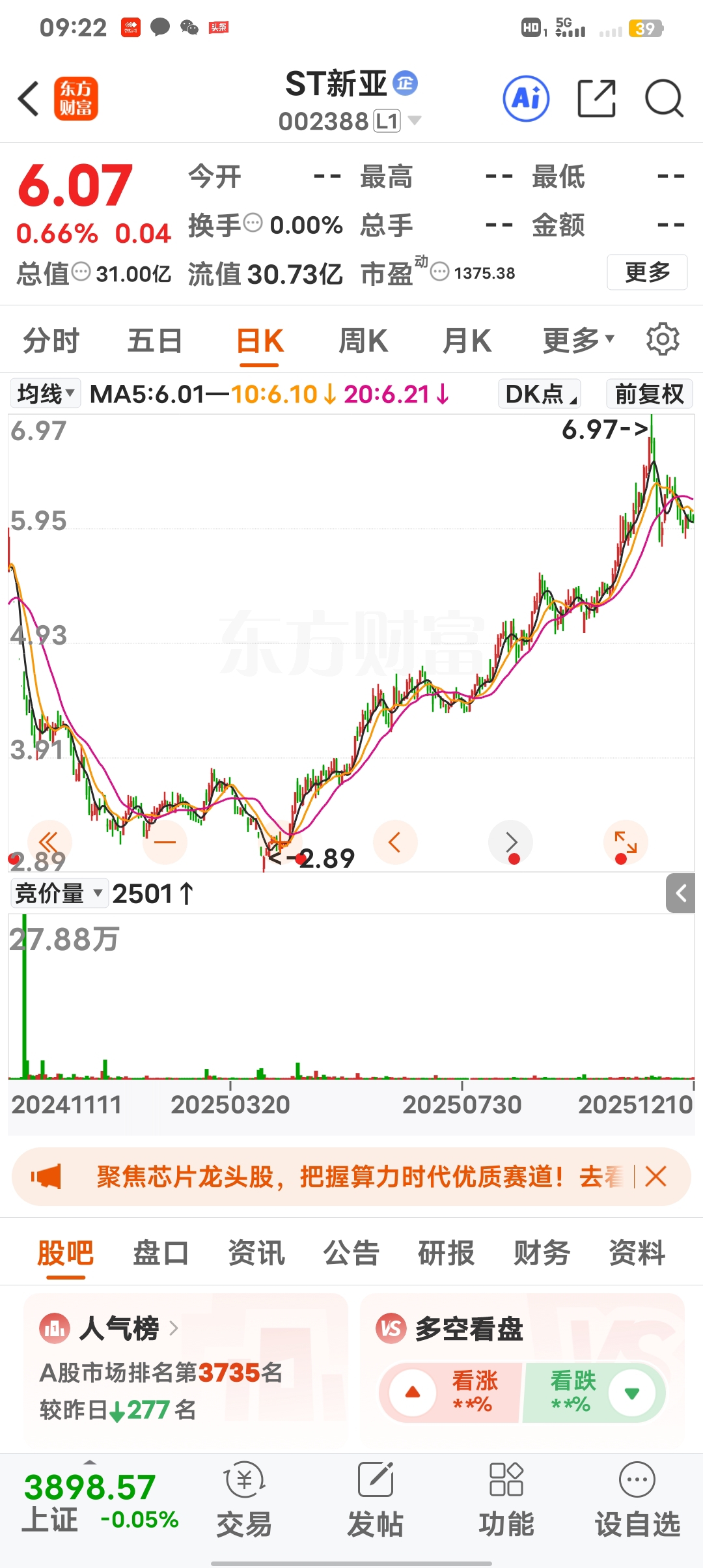 $ST新亚(SZ002388)$ 新亚从2.89元涨到6.97元,主力已经挣了一倍的利润,现在你进场就是去接盘,最少也要等跌到5元再进。今天走势破位了,下跌才刚刚开始,一定要管住手。