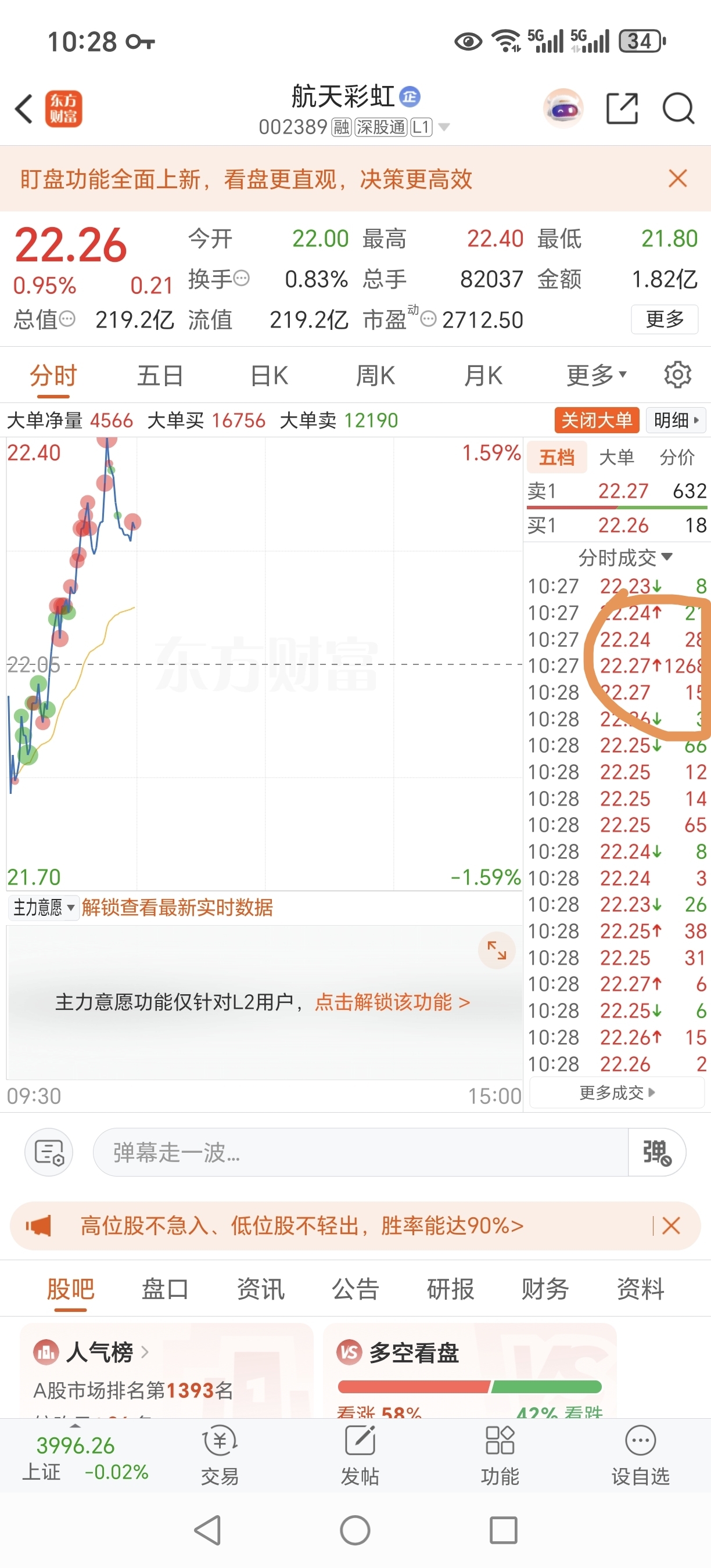 $航天彩虹(SZ002389)$ 超大单吃了22.27你们还在害怕什么 22.27以后就是底部了