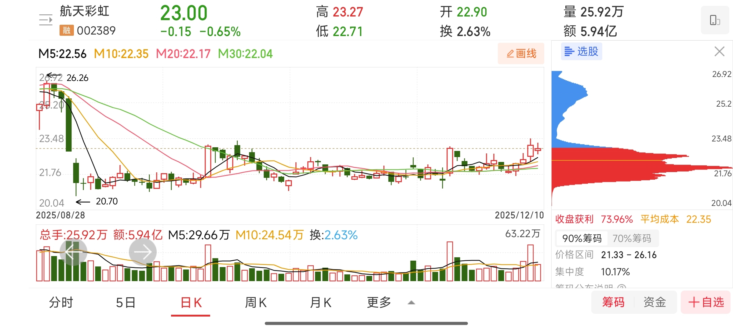 $航天彩虹(SZ002389)$ 看图形和筹码峰,这票是真的很完美,横盘震荡了几个月消化前期套牢盘,近期放量突破缩量回踩,如果能来个大阳线涨停突破,那高度就打开了,今天忍了又忍,不舍得卖,怕T飞