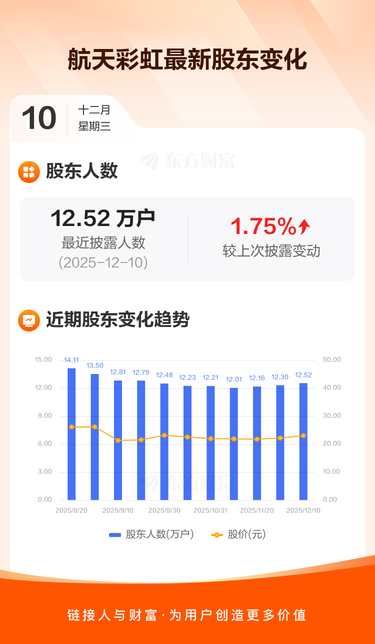 航天彩虹最新披露数据显示,截至12月10日公司股东户数为12.52万户,较上期(2025年11月28日)增加2148户,增幅为1.75%。户均持有流通股数量由上期的8004股下降至7867股,户均持股金额由上期的17.69万元增加至18.10万元。