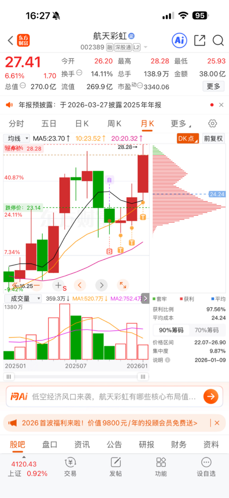 $航天彩虹(SZ002389)$ 不以涨喜,不以跌悲,谁也无法预测走势,既然你没有抬轿子的本事你就只能在你的认知里做交易,有人割肉离场,有人小赚离开,有人全仓梭哈,赚到钱就是对的,但是你能吃到哪一块全凭认知