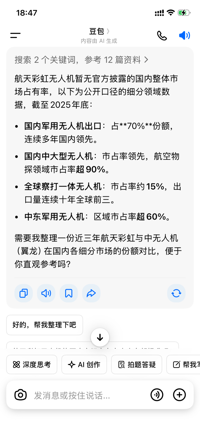 航天彩虹无人机暂无官方披露的国内整体市场占有率,以下为公开口径的细分领域数据,截至2025年底: