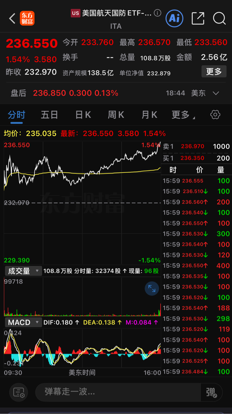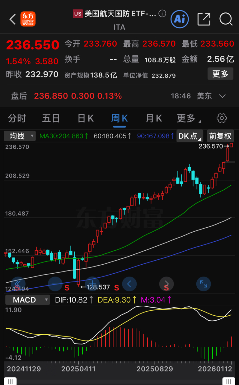 美国航天国防ETF指数ITA隔夜又涨1.54%,今天军工板块接力继续上涨,坐稳了