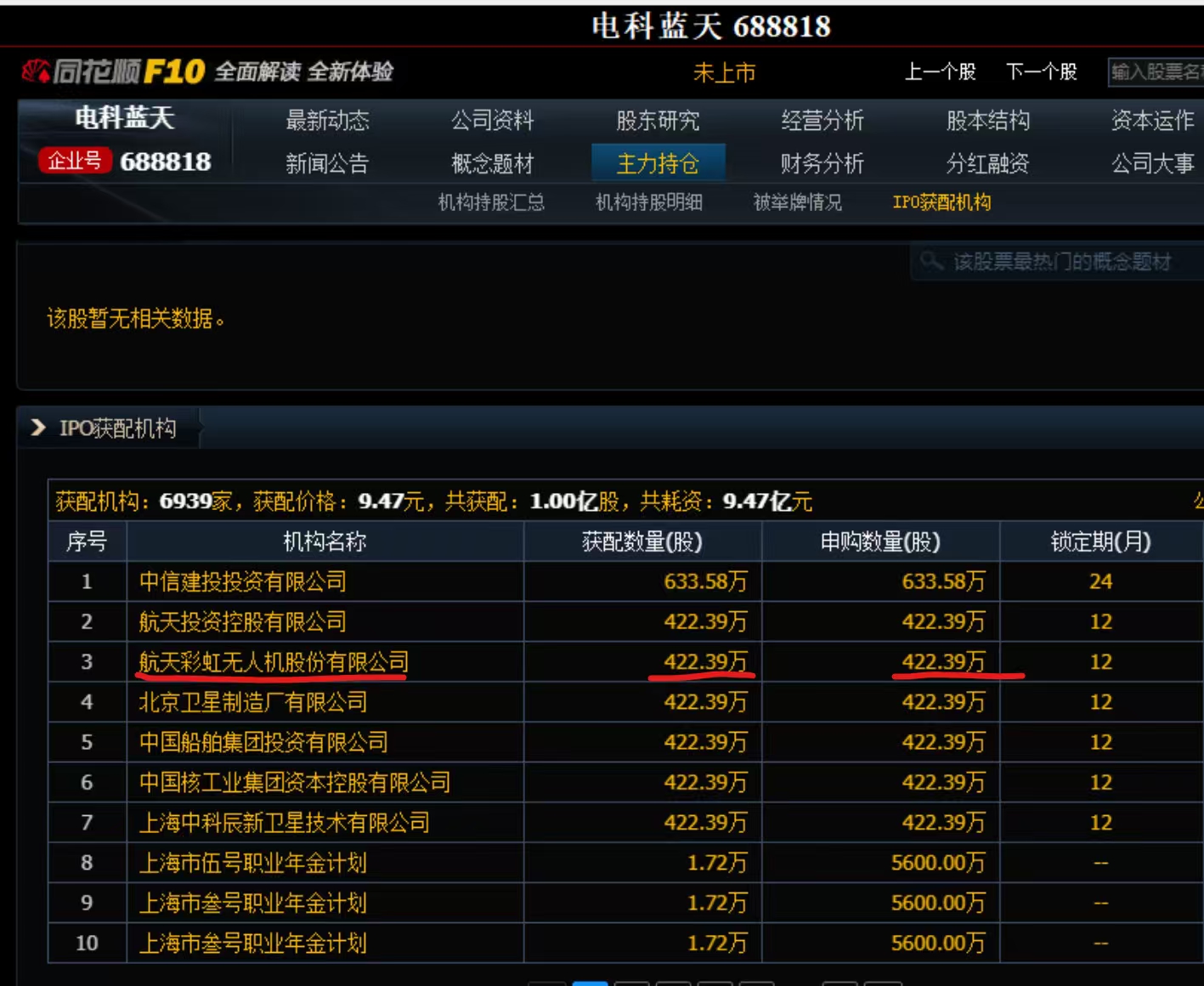 重磅!航天彩虹实锤已经获配422.39万股电科蓝天的股份,有不清楚的可以去电科蓝天F10查询,铁证如山!