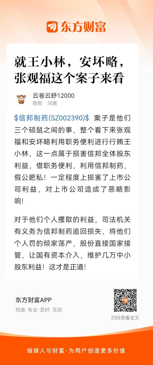 $信邦制药(SZ002390)$  案子是他们三个硕鼠之间的事,整个看下来张观福和安坏略利用职务便利进行行贿王小林,这一点属于损害信邦全体股东利益,借职务便利,利用信邦制药,假公肥私!一定程度上损害了上市公司利益,对上市公司造成了恶略影响!