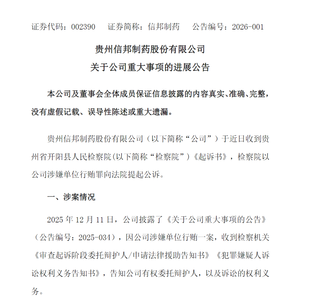 1月6日晚间,信邦制药(002390)公告,公司于近日收到贵州省开阳县人民检察院(简称“检察院”)《起诉书》,检察院以公司涉嫌单位行贿罪向法院提起公诉。
