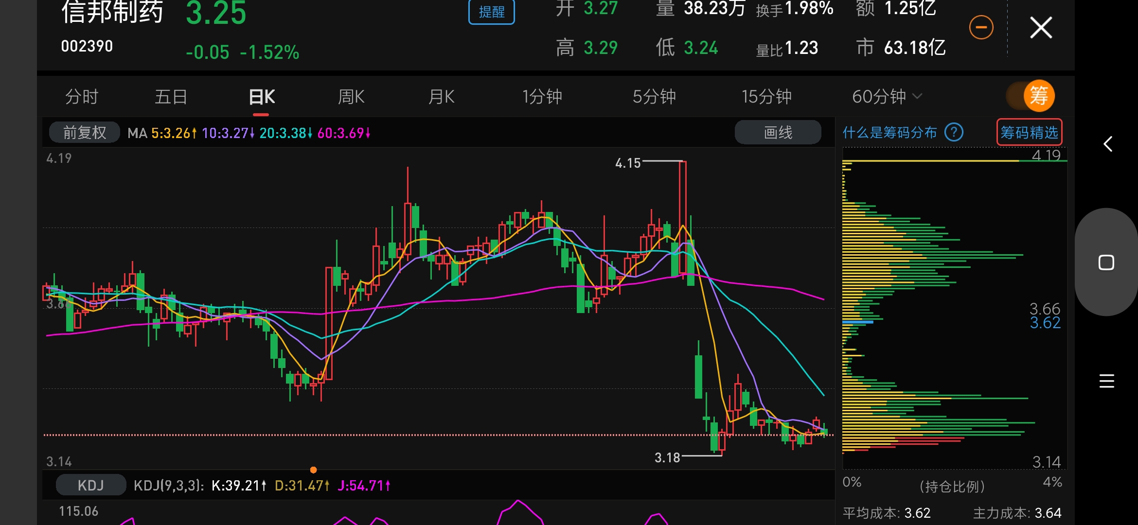$信邦制药(SZ002390)$ 主力近期平均成本3.64,庄家成本3.50!仍在磨底吸筹,以降低成本!