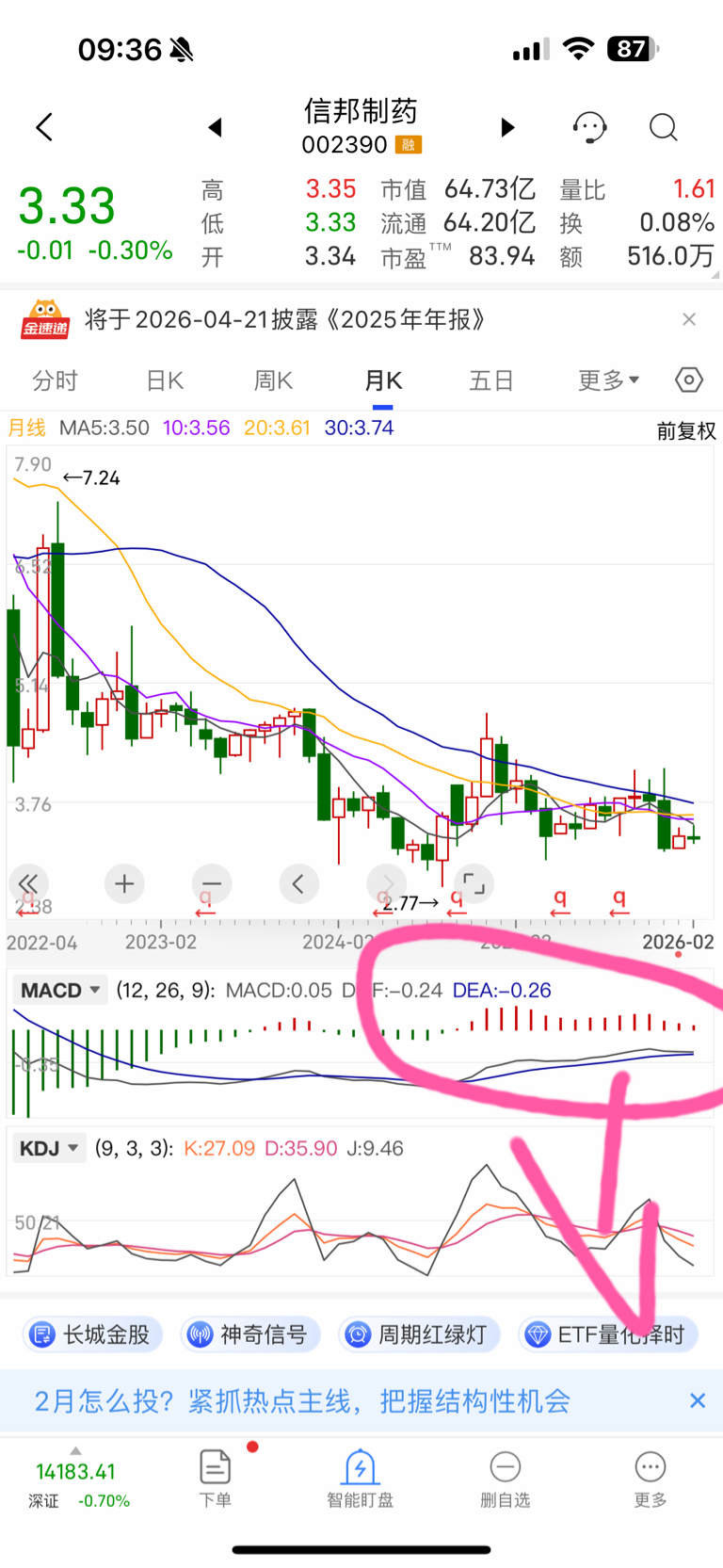 $信邦制药(SZ002390)$ 这是信邦的月线macd。肯定是奔着死叉去调整了。3元过完年回来会跌破。