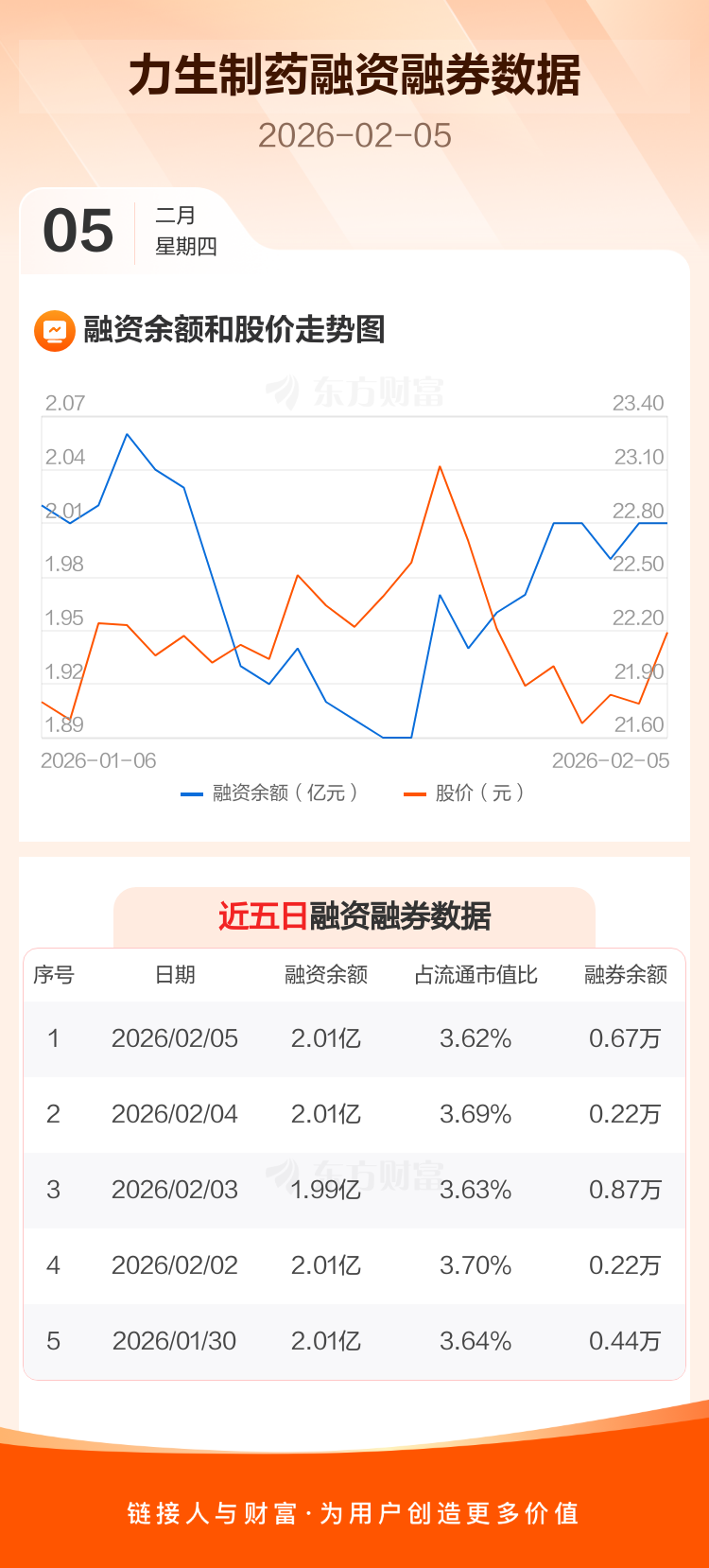 交易所最新数据显示,力生制药于2026年2月5日获融资买入1060.43万元,融资偿还1041.47万元,当日融资净买入18.96万元。目前,该股融资余额2.01亿,占流通市值比例为3.62%。