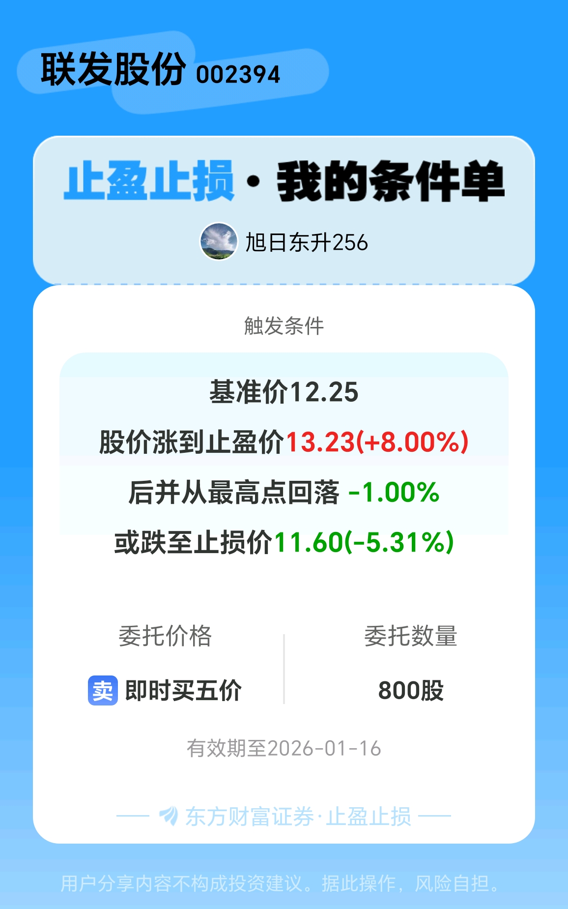 #条件单交流# #止盈止损晒单# 一位股神设置了一个止盈止损条件单,接下来就是见证奇迹的时刻~$联发股份(SZ002394)$