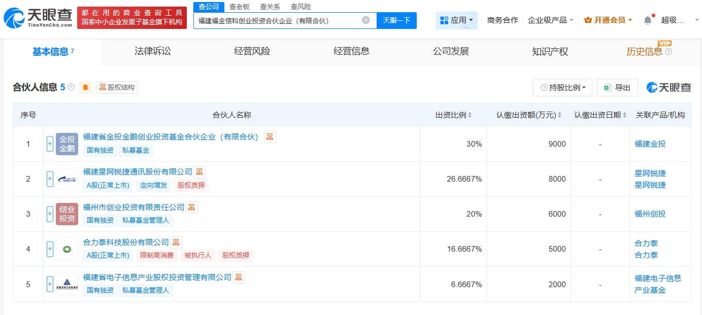 每经AI快讯,天眼查工商信息显示,近日,福建福金信科创业投资合伙企业(有限合伙)成立,执行事务合伙人为福建省电子信息产业股权投资管理有限公司,出资额3亿元人民币,经营范围包括创业投资,以私募基金从事股权投资、投资管理、资产管理等活动。合伙人信息显示,该合伙企业由福建省金投金鹏创业投资基金合伙企业(有限合伙)、星网锐捷(002396)、合力泰(002217)等共同出资。