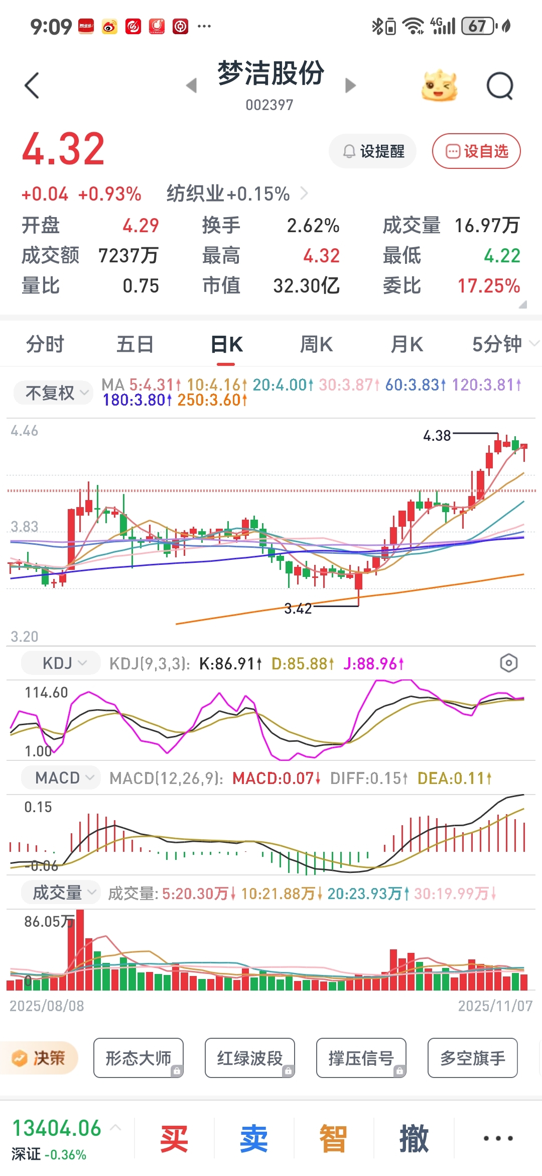 $梦洁股份(SZ002397)$ 今天11月7日这根K线跟10月31日哪根K线是否相似,也是1毛钱的下影线,庄家控的如此精确,难道是巧合吗?请各位三思。