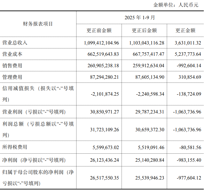 1月16日,梦洁股份(002397)发布公告,针对前期会计差错进行更正。公司2025年前三季度营业总收入由10.99亿元降至更正后的11.03亿元;归母净利润由更正前的2652万元降至更正后的2554万元,下降98万元,具体如下: