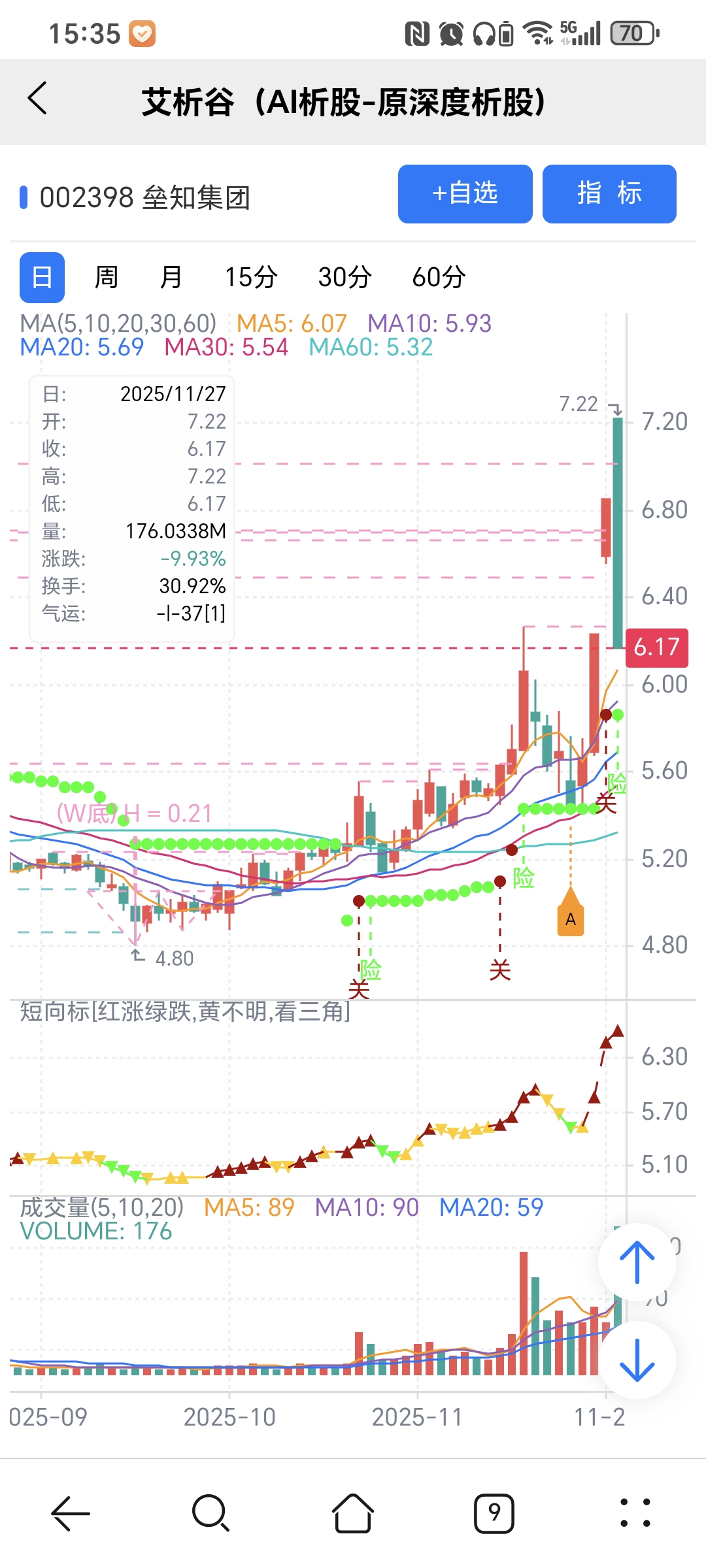 红绿小圆点是艾析谷的量化指标-超级短趋线,是趋势跟踪+突破类的量化指标,完全免费。