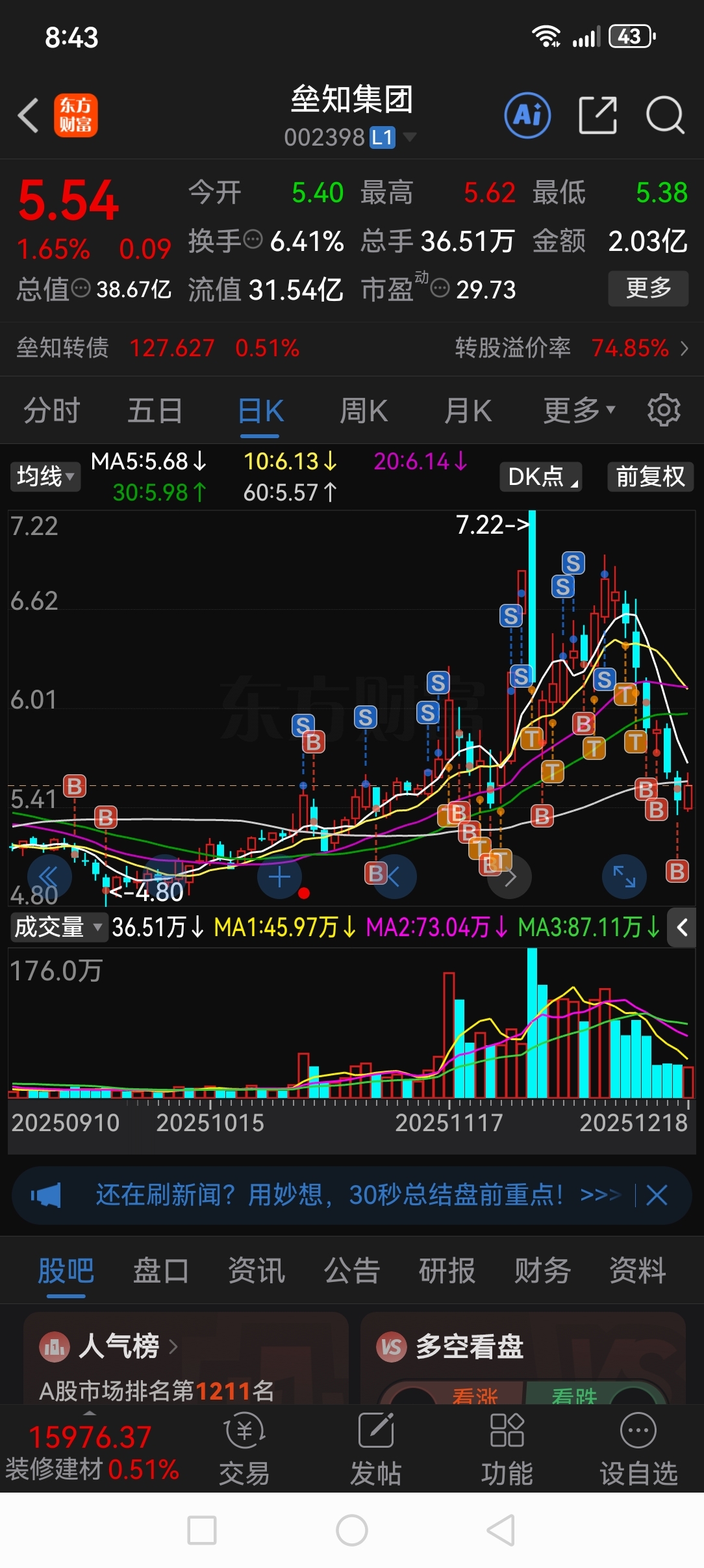 $垒知集团(SZ002398)$ 满屏的BST最多套4万到现在盈利2万成本负。