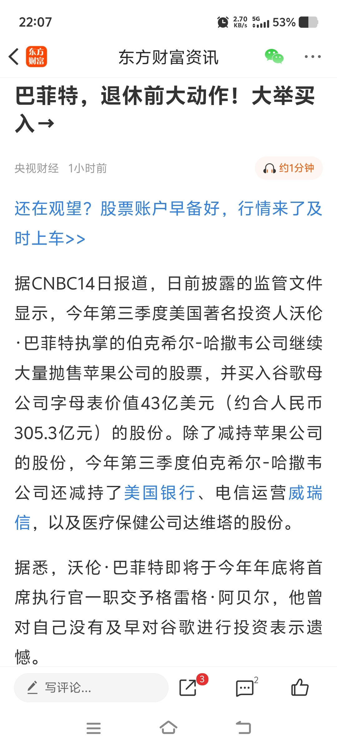 $省广集团(SZ002400)$ 巴菲特大量买入谷歌