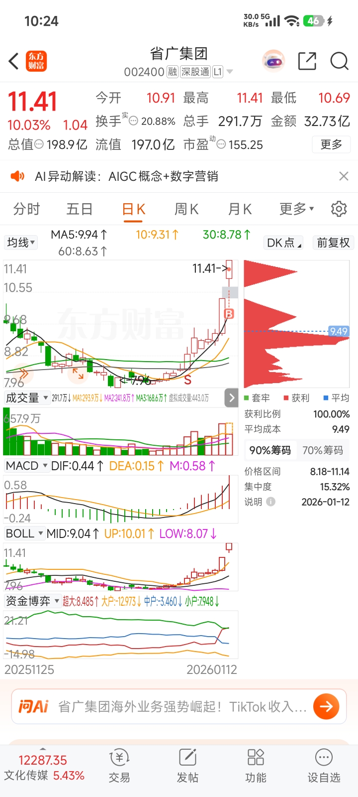 $省广集团(SZ002400)$ $利君股份(SZ002651)$ $盛路通信(SZ002446)$ 今天早盘不赚不亏砸了利君和盛路,中途介入省广,本来盛路利君就是冲动交易,及时纠错,去做大资金平铺的板块。
