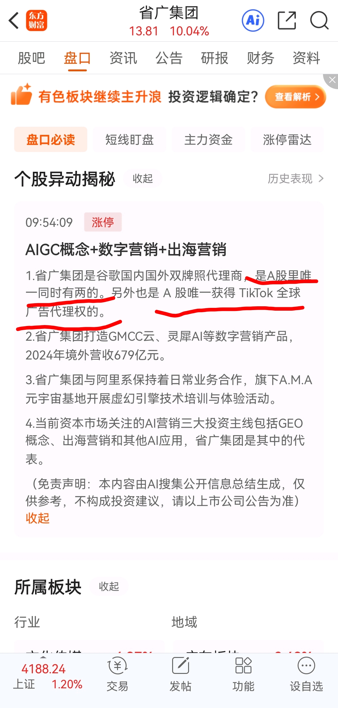 $省广集团(SZ002400)$ 不吹都不行了,这次春晚就是字节跳动独家AI代理的,你说不涨都不可能,而且A股唯一一个抖音广告总代理,你想做抖音广告都离不开省广